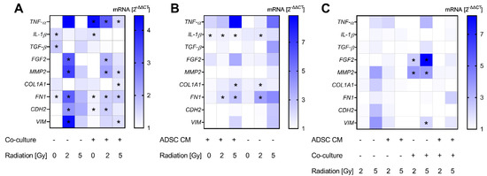 Alterations in gene expression profiles at the mRNA level in MCF-10A cells. The heatmaps show mean relative mRNA expression in MCF-10A cells compared to GAPDH/YWHAZ and to the corresponding control group, n = 3 replicate experiments. (A) Shows the effect of treatment with conditioned medium (CM) of adipose-derived stem cells (ADSC) normalized to treatment with control CM. (B) Presents the effect of co-cultivation with fibroblasts normalized to monocultures. The effect of irradiation is demonstrated in (C), whereby irradiation with 2 Gy and 5 Gy is normalized to 0 Gy. Values were calculated using the 2−ΔΔCT method, 2−ΔΔCT of control = 1. White fields: 2−ΔΔCT < 1; * p < 0.05, increased compared to the corresponding control (Mann–Whitney U-test). TNF-α: tumor necrosis factor alpha, IL-1β: interleukin-1β, TGF-β: transforming growth factor-β, FGF2: fibroblast growth factor-2, MMP2: matrix metallopeptidase 2, COL1A1: collagen type I alpha 1 chain, FN1: fibronectin 1, CDH2: cadherin-2/N-cadherin, VIM: vimentin.