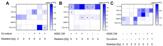 Alterations in gene expression profiles at the mRNA level in MRC-5 cells. The heatmaps show mean relative mRNA expression in MRC-5 cells compared to GAPDH/YWHAZ and to the corresponding control group, n = 3 replicate experiments. (A) Shows the effect of treatment with conditioned medium (CM) of adipose-derived stem cells (ADSC) normalized to treatment with control CM. (B) Presents the effect of co-cultivation with MCF-10A cells normalized to fibroblast monocultures. The effect of irradiation is demonstrated in (C), whereby irradiation with 2 Gy and 5 Gy is normalized to 0 Gy. Values were calculated using the 2−ΔΔCT method, 2−ΔΔCT of control = 1. White fields: 2−ΔΔCT < 1; * p < 0.05, increased compared to the corresponding control (Mann–Whitney U-test). IL-1β: interleukin-1β, TGF-β: transforming growth factor-β, FGF2: fibroblast growth factor-2, MMP2: matrix metallopeptidase 2, COL1A11: collagen type I alpha 1 chain.