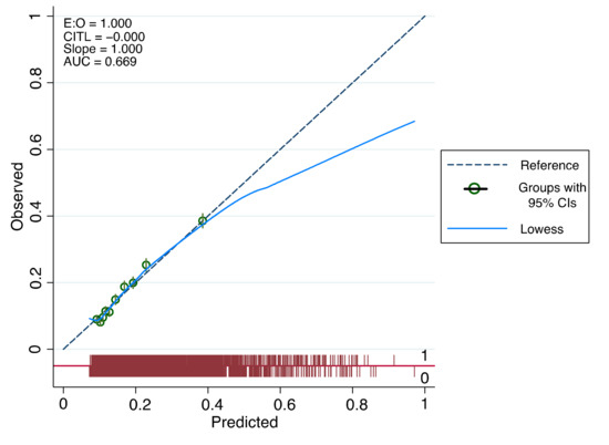 The bootstrap analysis with 200 replication samples generated a mean AUC of 0.667 (95% CI: 0.656, 0.678). The difference between this and the original data set’s AUC was utilised to calculate an optimism adjusted AUC of 0.6701 (95% CI: 0.660, 0.684).
