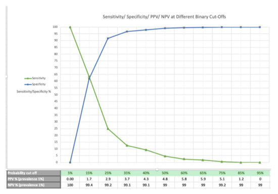 Sensitivity/specificity/positive predictive values (PPV)/negative predictive values (NPV) for a prevalence of 1% at different probability cut-offs.