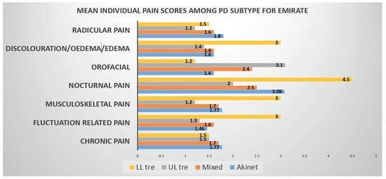 Graphical representation of PD subtype vs. pain domains (KPPS) in Emiratis. In this graph it can be seen that Nocturnal pain (NP) is found to be higher in all the PD Subtypes where as Radicular pain scores high in Tremor Dominant Subtype.