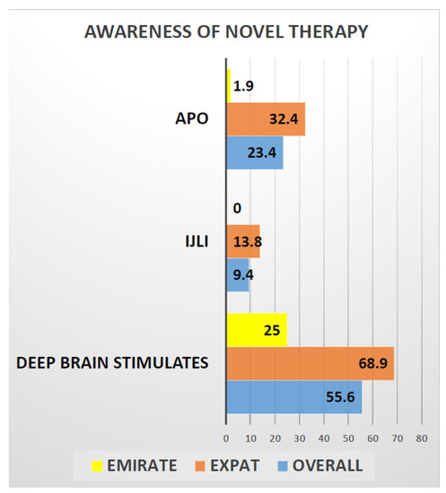 Graphical representation of the awareness of novel therapies in PD treatment among the Emiratis and Expats. This graph shows only 25% of Emirates are aware of deep brain stimulation test compared to 69% Expats and 2% of Emirates are aware of Apomorphine pump treatment compared to 32% of Expats. Whereas Not even a single ( 0%) Emirati is aware of Ileo-jejunal levodopa infusion compared to 13% of expats.