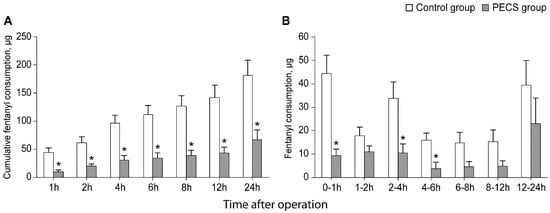 Dose of cumulative fentanyl consumption (A) and fentanyl consumption during 24 h after operation (B). Values are presented as mean ± standard error. PECS, pectoralis nerve II block. * Bonferroni corrected p < 0.05 versus the control group.