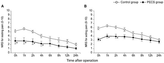 Numerical rating scale for resting (A) and acting (B) pain intensity during 24 h after operation. Values are presented as mean ± standard error. PECS, pectoralis nerve II block; NRS, numerical rating scale. * Bonferroni corrected p < 0.05 versus the control group.