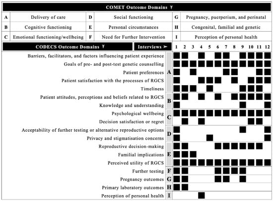 Outcomes from this qualitative study mapped to 18 CODECS domains (Figure 2). All outcomes mapped to existing CODECS domains; therefore, no new outcome domains were identified. Nine overarching COMET taxonomy outcome domains were represented: delivery of care (n = 12, 100%), cognitive functioning (n = 12, 100%), emotional functioning/wellbeing (n = 10, 83%), social functioning (n = 7, 58%), personal circumstances (n = 7, 58%), need for further intervention (n = 6, 50%), pregnancy, puerperium and perinatal outcomes (n = 5, 42%), congenital, familial and genetic outcomes (n = 2 17%), and perception of personal health (n = 1, 8%).
