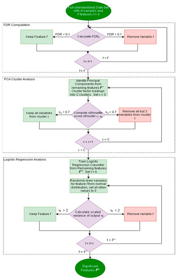 It is important to determine if the inputs of a particular classifier are part of the significant features of the data set, as most classifiers only make use of a subset of the available measurements. In this regard, a factor analysis method is employed herein that pares down the original dataset into a small subset of important features. This subset of important features should then be compared to the input features to determine if the input features are statistically meaningful in the data. The workflow for performing the factor analysis is shown in Figure 1 [16]. The approach consists of three main parts: (1) false discovery rate calculation, (2) factor loading clustering, and (3) logistic regression variance calculation. F′, F″, and F* are the remaining features after steps (1), (2), and (3), respectively (as per Figure 1). Each step removes features until a subset of features is left, and the factor analysis procedure is focused on achieving certain benchmarks without defining a specific number of metabolites to screen for.