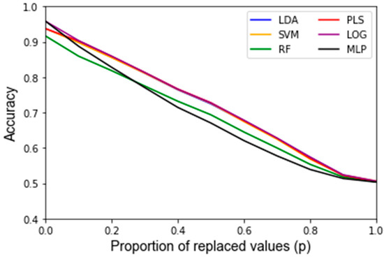 The first step of the robustness assessment was to compare the features identified as statistically significant by the factor analysis to those that were selected as inputs for each classifier. A deeper analysis of the feature selection results is present in Appendix C. A total of 11 metabolites of the original 24 were identified as significant by the factor analysis protocol. These metabolites were % DNA methylation, 8-OHG, fCystine/fCysteine, Nitrotyrosine, Tyrosine, Glu-Cys, Cys-Gly, GSSG, tGSH/GSSG, %Oxidized Glutathione, and Chlorotyrosine. All 7 metabolites identified by Howsmon et al.’s classification analysis were present among these 11 metabolites. Using that panel of seven metabolites, Howsmon was able to achieve a cross-validatory accuracy of 96.9% using LDA [30]. In a more recent study using the same dataset, Qureshi et al. was able to achieve a cross-validatory accuracy of 97% using SVM and five metabolites [42]. Again, all features used in this classifier were present among the 11 identified by the factor analysis. The features selected as inputs for each classifier in this study are included in Table 1. For LDA, MLP, and LOG, all the features used as inputs were among the metabolites deemed important by the factor analysis protocol. In the case of PLS-DA and SVM, four out of five were identified as important (% DNA Methylation, 8-OHG, Glu-Cys, and fCystine/fCysteine), whereas in the RF classifier only two were considered important (%DNA Methylation and fCystine/fCysteine). Therefore, it is expected that the RF classifier is more sensitive to variations than the other classifiers due to the fact that it contains less statistically relevant features. To a lesser degree, these concerns also exist for the SVM and PLS classifiers.