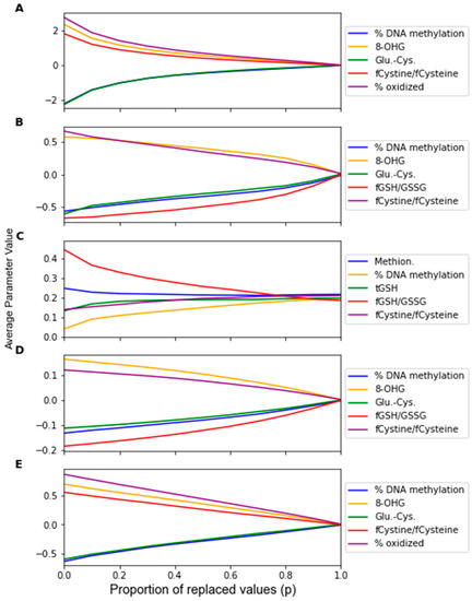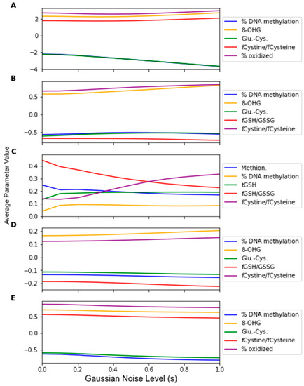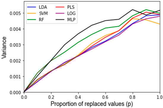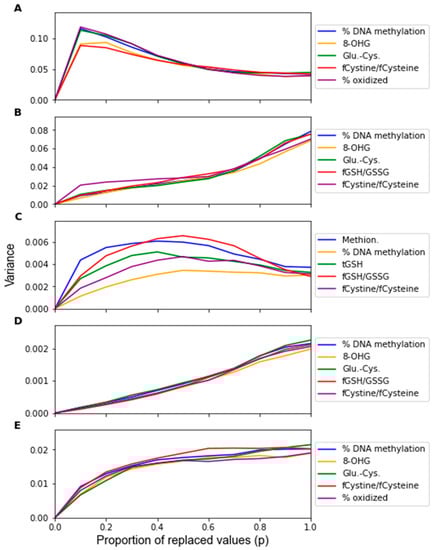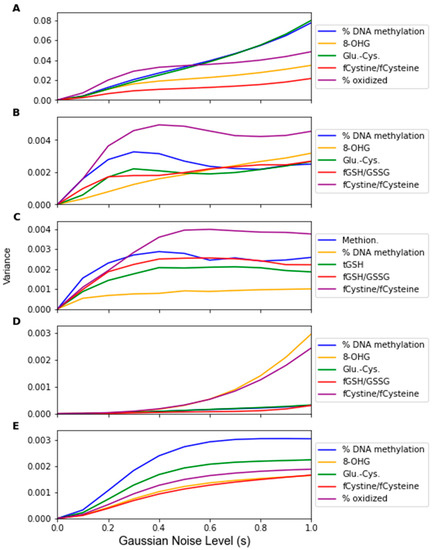 The change in the feature importance in response to replacement noise was assessed by the change in the average classifier parameter values with an increasing noise level p (Figure 5) and the variance of these parameters across 1000 noise corruptions of the same value of p (Figure 6). All the parameters effectively start at separate and distinct values, and they all converge to become approximately the same as p increases. Essentially, as more data are replaced by random noise, the differences between the information in each feature is less pronounced. For each classifier, the parameters tend to follow the same trends for the parameter variance with an increasing p. It should be noted that the parameters that had a greater overall increase in variance and demonstrated such an increase at a lower proportion of replaced values were the parameters of RF that were not identified by the factor analysis procedure, including the coefficients of Methionine, tGSH, and fGSH/GSSG. However, in the PLS and SVM classifiers, the parameters of the feature not identified by the factor analysis procedure (fGSH/GSSG) did not deviate significantly from the behavior of the other parameters.