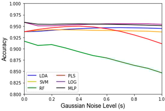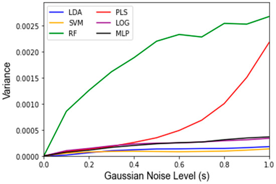 While Gaussian noise corruption caused a decrease in classifier accuracy in response to increasing noise level(s), this decrease was less severe than the accuracy decreases due to the replacement noise. Similar trends for the classifier accuracy are present for the testing accuracy and LOOCV accuracy, which are shown in Figure 7 and Figure A3, respectively. Figure 8 shows that the variance in the classifiers’ performance increases marginally for the LDA, MLP, SVM, and LOG classifiers in response to Gaussian noise (Figure A4 for cross validation). However, the variance of the performance increases significantly with increasing Gaussian noise levels for the RF classifier, and to a lesser extent the PLS-DA classifier. This further validates the idea that these classifiers are more sensitive to noise. Conversely to replacement noise, the classifier parameters were largely unchanged in response to Gaussian noise, shown in Figure 9. The variance of the parameters (Figure 10) still increased with respect to the Gaussian noise level, s; however, a trend as to which parameters varied the most for each classifier was not apparent.