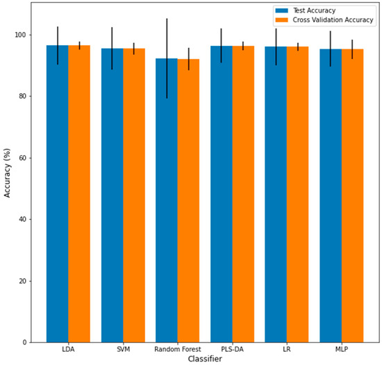 To assess the validity of the presented framework, five commonly used traditional ML algorithms and one neural network were used to develop classifiers for the dataset from Section 2.3 and evaluated using the steps described in Section 2.2. The goal of evaluating multiple classifiers is not to compare the outright performance between algorithms, but rather to demonstrate that different classifiers for the same dataset may not all be equally robust. Furthermore, it is useful to illustrate that this framework can be applied to classifiers constructed using different AI/ML algorithms. Specifically, the ML techniques used were (1) linear discriminant analysis (LDA) [31], (2) support vector machine (SVM) [32], (3) random forest (RF) [33,34], (4) partial least squares-discriminant analysis (PLS-DA) [35,36], and (5) logistic regression (LOG) [37,38]. While the primary focus of this study is to develop a robustness evaluation framework for traditional classifiers, a multilayer perceptron (MLP) was also used as many multivariable biomarkers make use of neural networks [39]. More details regarding each of these algorithms can be found in Section 2.4.2. Each of these methods was implemented using the appropriate functions of the scikit-learn package in Python [40]. Only five features were used as inputs for each classifier to prevent overfitting. A brief description of the feature selection technique is included in this section.