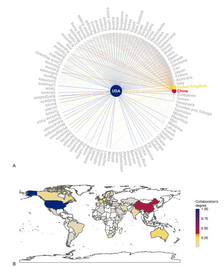 Panel (A): The plot shows the country collaboration network based on Scopus data. The vertex size is proportional to the number of collaborations, and the networks of the three most connected countries are highlighted. Panel (B): Spatial visualization of the degree of collaboration; blue and red colors correspond to the countries with more collaborations.
