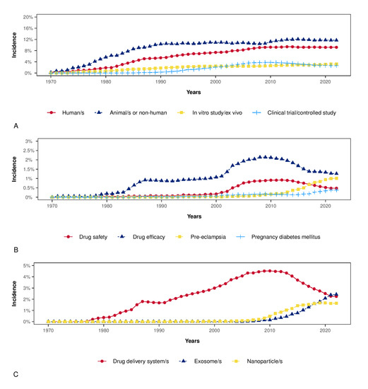 These plots show the annual incidence of a selected group of keywords among the top 100 (based on Scopus data). Panel (A): Keywords comprising the main type of studies. Panel (B): Keywords comprising the main topics in obstetrics. Panel (C): Trends in the annual incidence of the keyword “exosome” in comparison to “drug delivery system” and “nanoparticles”.