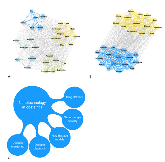 Panel (A): This network plot shows the title word co-occurrences from the Scopus database, considering the top 30 most frequent words. Panel (B): This network plot shows the abstract word co-occurrences from the Scopus database, considering the top 30 most frequent words. Panel (C): Main applications of nanotechnology in obstetrics.