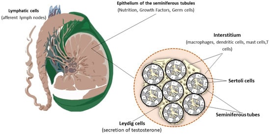 Immune privilege is confined to a few districts of the body, and, among them, the testicular environment is included. In fact, the proteins expressed on the spermatozoa membrane can elicit a robust immune attack, which may destroy spermatozoa, ultimately leading to infertility. Immune privilege relies on two major mechanisms: (I) the physical shield represented by the BTB, mainly consisting of Sertoli cells (SCs); (II) the tolerogenic response mounted by the immune armamentarium of the testis [21]. In this framework, it is important to briefly describe the structure of the testis for a better comprehension of its function. The epithelium of the seminiferous tubules holds SCs, which provide nutrition and growth factors to germ cells [22,23]. On the other hand, Leydig cells are interspersed between the tubules and secrete testosterone (T) for spermatogenesis to take place [24,25]. The interstitial space of the testis harbors lymphatic vessels, which permit access to afferent lymph nodes [26]. Peritubular lymphatic sinusoids surround the seminiferous tubules with lymphatic capillaries ubicated beneath the tunica albuginea [27]. Macrophages, dendritic cells (DCs), mast cells and T cells are contained in the interstitium, and their function will be described in a specific section of this review. The structure of the testis is depicted in Figure 1.
