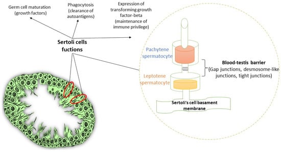 The BTB via SCs constitutes a physical barrier devoted to the protection of germ cells from a destructive immune attack. Besides that, testicular immune cells maintain either a tolerogenic milieu or protect spermatogenesis from pathogen invasion; thus, theycontrol inflammatory processes, which very often are responsible for male infertility [36,37,38]. In fact, evidence has been provided that infections or inflammatory states inhibit steroidogenesis, cause apoptosis of germ cells and destroy testicular epithelial cells, thus provoking infertility [39].