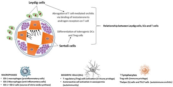 In this direction, transplanted SCs protect syngeneic islet grafts, generating Treg cells and decreasing release of IL-17 by T helper (h)17 cells [75]. In sum, SCs not only contribute to the BTB composition but also keep on check detrimental T cell responses. The testicular immune cells are expressed in Figure 3.