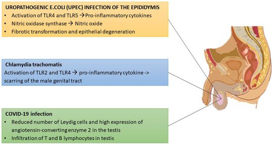 Chlamydia trachomatis (Ct) is the most frequent sexually transmitted pathogen in males, leading to chronic inflammation and scarring of the male genital tract [114]. Ct antigens bind to TLR2 and TLR4 and pathogen recognition receptors with massive liberation of proinflammatory cytokines, which account for chronicity of inflammation [115]. As far as viral diseases are concerned, mumps virus, an RNA virus, is the most frequent cause of epididymitis and orchitis, which in turn cause male infertility [116]. COVID-19 has been reported to infect the testis, impairing T secretion, thus inducing primary hypogonadism or aggravating a preexistent status of hypogonadism [117]. In particular, a reduced number of Leydig cells have been detected in COVID-19 patients along with a high expression of angiotensin-converting enzyme 2 in the testis [118,119,120,121]. Additionally, involvement of testicular T and B lymphocytes in COVID-19 infection has been reported [122]. Infections of the male reproductive tract are illustrated in Figure 5.