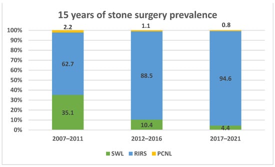 Figure 1 depicts the changing trends in surgical management of nephrolithiasis during a 15 year period divided into three parts: 2007–2021, 2012–2016, and 2017–2021.
