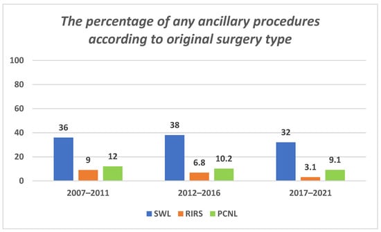 The median leave for URS/RIRS and PCNL decreased significantly during the 15 year study period (7 vs. 4 days, p = 0.05 and 10 vs. 6 days, p = 0.036, respectively), while there was no change for SWL. There was a substantial decline in ancillary procedures during the follow-up period in the URS/RIRS group (9% in 2007–2011, 6.8% in 2012–2016, and 3.1% in 2017–2022, p < 0.01), but not in the SWL or PCNL groups (Figure 2).