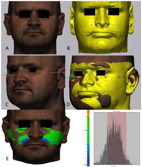 (A): Postoperative 3D scan, (B): Preoperative simulation of the postoperative soft-tissue (IPS CaseDesigner®), (C,D): RPS-Alignment, using 15 pairs of reference points in the nasal, periorbital, and zygomatic area of the face, (E): An example of the surface congruence for the anatomic area (upper cheek) illustrated with a colour-coded error map.