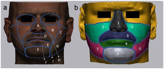 (a): Facial aesthetic units based on Fattahi et al. A: nose; B: cheek unit (medial subunit); C: cheek unit (zygomatic subunit); D: upper lip unit (philtrum + lateral + mucosal subunit); E: lower lip unit (central + mucosal subunit); F: mental unit; G: cheek unit (lateral + buccal subunit); H: melolabial fold; I: labiomandibular fold; J: mentolabial fold. (b): Segmentation of the soft-tissue simulation. 1: nose; 2: upper cheek (B+C); 3: upper lip (D); 4: lower lip (E); 5: lower cheek (G); 6: chin (F); 3+4: both lips; 1+2+3+4+5+6: face total.