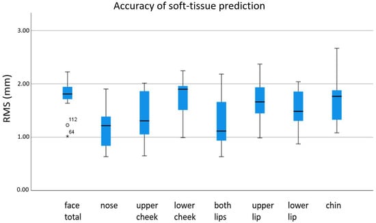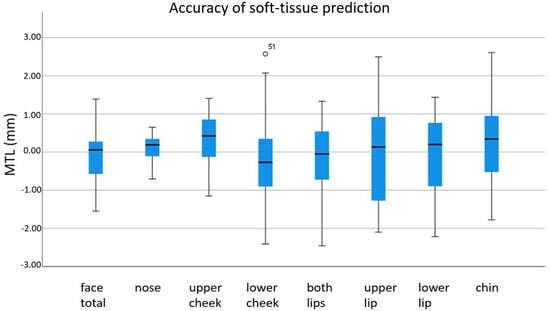 Regarding the perioral region, in this study, the upper lip was more precisely predicted than the lower lip, which achieved the lowest values for IO%. Peterman et al. explained that the inaccuracy of lower lip prediction was due to both the effect of the anterior tooth position on the lower lip and the muscle tone of the perioral muscles [9]. Furthermore, Maal et al. came to similar conclusions by examining a different VSP system. The region with the lowest accuracy was the lower lip area. The mean absolute 90th percentile of the deviation in the lower lip area was 2.5 mm in their study [34]. Of course, it cannot be ruled out that the low values of prediction accuracy in the region of the lower lip were also caused by movements made by the patient during the CBCT or the 3D scan, although all patients received clear instructions, and the position of the patient’s head was controlled by the same operator every time. By contrast, Demirsoy et al. obtained the least accurate predictions, with a mean difference exceeding 3 mm, in the upper lip area using the VSP system SimPlant master software [10].