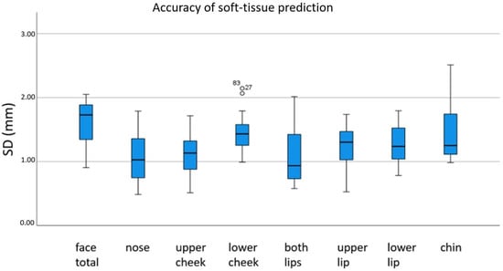Standard deviation between postoperative 3D scan and preoperative soft-tissue simulation. °: moderate outlier: 1.5 – 3.0 × IQR (interquartile range).
