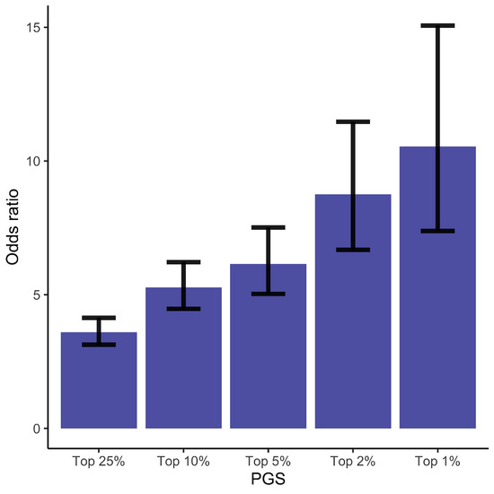 To identify women at high risk of GDM, we computed odds ratios (ORs) for GDM by contrasting the individuals ranked in the top 1%, 2%, 5%, 10%, and 25% PGS values to the individuals whose PGS values are in the lower 50%. Compared to women in the lowest half of the PGS, women in the top quantile have OR = 3.60 (CI = [3.13–4.14]), for the top 10% OR = 5.27 (CI = [4.47–6.22]), for the top 5% OR = 6.15 (CI = [5.03–7.52]), for the top 2% OR = 8.75 (CI = [6.68–11.47]), and for the top 1% OR = 10.55 (CI = [7.38–15.06]) (Figure 1 and Supplementary Table S2). Here CI stands for 95% confidence interval. Similar results are obtained for a step-wise model (Supplementary Table S2).