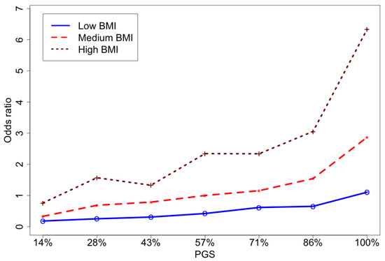 The odds ratios of the groups defined based on BMI and PGS levels. The group of participants with medium-level PGS (43–57%) and medium level BMI (25–30) are taken as a reference group (Supplementary Table S2).
