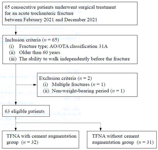 - Mochizuki, Y.; Yamamoto, N.; Fujii, T.; Noda, T.; Ozaki, T. Effect of Cement Augmentation on Early Postoperative ADL Score in Patients Treated with Cephalomedullary Nailing for Trochanteric Fractures. Available online: https://www.protocols.io/view/effect-of-cement-augmentation-on-early-postoperati-btmbnk2n (accessed on 27 June 2022).