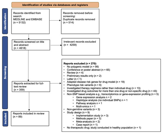 The initial literature search conducted in MEDLINE and EMBASE identified 5132 articles. After removal of 514 duplicates, 4618 articles remained for title and abstract screening. From these, 4259 irrelevant studies were excluded by two independent investigators, leaving 359 reports to be extracted for full-text review. Following full-text screening, 100 articles were initially included. During detailed data extraction, an additional 11 reports were excluded as they were found not to include a pharmacogenetic model with multiple genes, leaving 89 papers for inclusion in the systematic review (Figure 1). Full details on included studies can be found in Table S1.