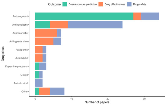 Included papers were published on or before the search date (27 July 2021). The vast majority of drugs for which polygenic predictive models are developed fall under anticoagulants (n = 32, 36.0%) or antineoplastic agents (n = 22, 24.7%). Of the anticoagulants studied, all were vitamin K antagonists. Drug outcomes under investigation were categorized under three main categories: drug safety (i.e., adverse drug reactions), drug dosing requirements (including drug exposure prediction), and drug effectiveness. Of these, drug dosing requirements was the most common outcome under investigation when developing polygenic prediction models (n = 33, 37.1%) [18,24,25,26,27,28,29,30,31,32,33,34,35,36,37,38,39,40,41,42,43,44,45,46,47,48,49,50,51,52,53,54,55], followed by drug safety (n = 32, 36.0%) [56,57,58,59,60,61,62,63,64,65,66,67,68,69,70,71,72,73,74,75,76,77,78,79,80,81,82,83,84,85,86,87] and drug effectiveness (n = 24, 27.0%) [88,89,90,91,92,93,94,95,96,97,98,99,100,101,102,103,104,105,106,107,108,109,110,111]. The vast majority of studies investigating dosing requirements were conducted in regard to anticoagulant therapy, whereas the majority of drug safety studies were conducted in antineoplastics. A summary of investigated drug outcomes stratified by drug class can be seen in Figure 2.