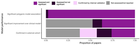 Over half the included papers (n = 56, 63.0%) included some form of model validation in their analysis or were validated in a future study. However, only 36 (40.4%) models were tested in an independent cohort for external validity. As mentioned previously, secondary cohorts of patients treated with the same drug may not be readily available due to sample size constraints. In these cases, some studies (n = 16, 18.0%) performed internal validation using cross-validation or internal bootstrap samples to validate their model. Expectedly, internal validation of polygenic prediction models was far more successful than external validation. Where all internally validated models reported successful validation with only a slight reduction in performance, over one third (n = 14, 38.9%) of externally validated models did not validate successfully in an independent patient population. Model validation is also summarized in Figure 3.
