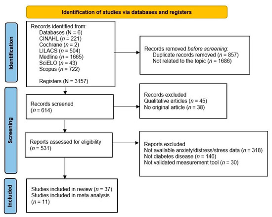 Studies conducted during the COVID-19 pandemic were included with the following inclusion criteria: (1) original studies, (2) type 1 diabetes mellitus (T1DM) or type 2 diabetes mellitus (T2DM), (3) assessing anxiety, distress, or stress symptoms (percentages, means, or median levels), (4) use of anxiety, distress, and stress validated measurement tool. There was no restriction by language or publication date.