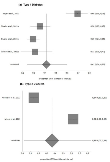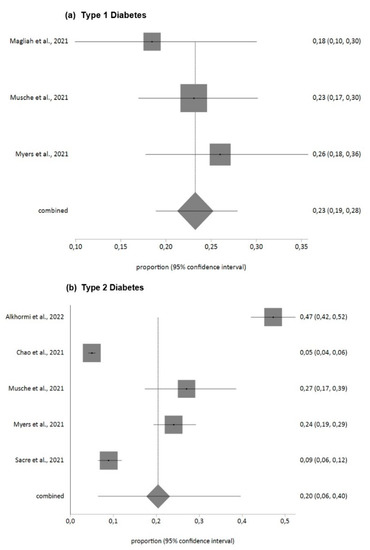 Prevalence of anxiety in DM patients during COVID-19 pandemic (GAD-7). (a) Type 1 Diabetes [48,51,52], (b) Type 2 Diabetes [30,37,51,52,58].