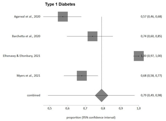 - Shafiee, A.; Teymouri Athar, M.M.; Nassar, M.; Seighali, N.; Aminzade, D.; Fattahi, P.; Rahmannia, M.; Ahmadi, Z. Comparison of COVID-19 Outcomes in Patients with Type 1 and Type 2 Diabetes: A Systematic Review and Meta-Analysis. Diabetes Metab. Syndr. 2022, 16, 102512. [Google Scholar] [CrossRef] [PubMed]