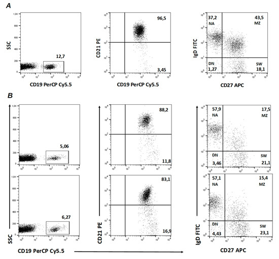 - Schulz, E.; Hodl, I.; Forstner, P.; Hatzl, S.; Sareban, N.; Moritz, M.; Fessler, J.; Dreo, B.; Uhl, B.; Url, C. CD19+ IgD+ CD27− Naïve B Cells as Predictors of Humoral Response to COVID 19 mRNA Vaccination in Immunocompromised Patients. Front. Immunol. 2021, 12, 803742. [Google Scholar] [CrossRef]