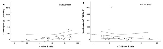 Scatter plots showing linear correlation between B-cell subpopulations and t3 anti-spike IgG serum levels in systemic sclerosis (SSc) patients. (A): Positive linear correlation between percentage of naive B cells and t3 anti-spike IgG serum levels (p < 0.001); (B): Negative linear correlation between percentage of CD21low B cells and t3 anti-spike IgG serum levels (p < 0.01).
