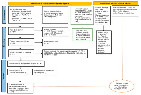 Entire selection and screening procedures are described in the PRISMA flowchart. In total, 2 HR (Hazard Ratio) values were included in the meta-analysis; the first value was taken from the study included in the primary outcome, and the second HR value was obtained from the bioinformatics analysis of the TGCA cohort. After the removal of duplicates, 429 studies were excluded since miR-197 was only mentioned in the text or not related to HNSCC. Subsequently, 39 more studies were excluded because they did not report any miR-197 expression values or prognostic indices of survival. In the green boxes, a further search of articles is shown, which was conducted on August 3, 2022, and did not lead to the inclusion of any additional studies.