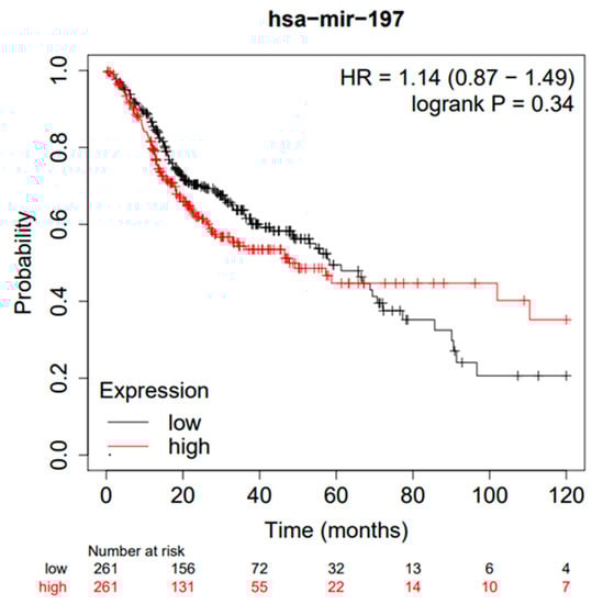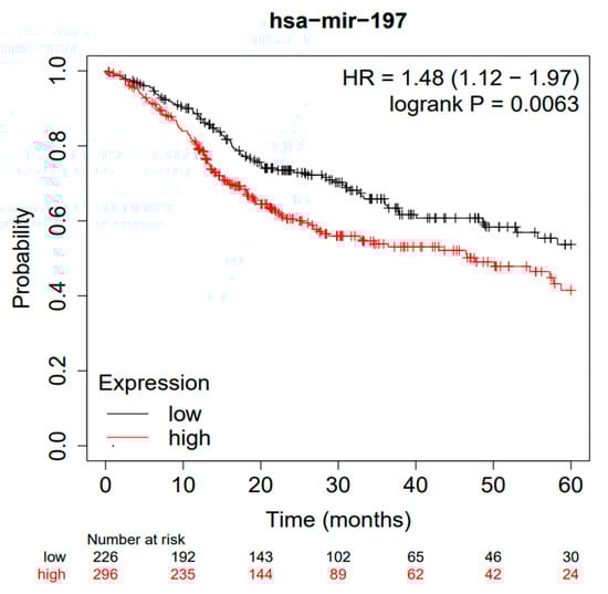 Kaplan–Meier curves according to the miR-197 expression levels for overall survival (OS) of patients with HNSCC (TGCA cohort). Kaplan–Meier curves created by the public database and web application Kaplan–Meier plotter (http://kmplot.com/analysis/, accessed on 1 August 2022).