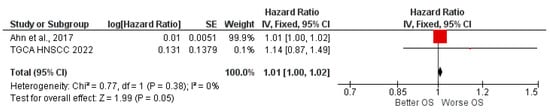By obtaining the data from the studies and the bioinformatics analysis of the TGCA relating to HR for OS between high and low miR-197 expression, a meta-analysis of the data was performed; the heterogeneity between the included data was low, with a Chi2, df = 1 (p = 0.38) equal to 0.77, and an I2 equal to 0%, which was applied to a fixed effects model. The results of the meta-analysis reported an aggregate HR for OS between high and low miR-197 expressions of 1.01, with relative confidence intervals [1.01 1.02], and the test for the overall effect was Z = 1.99 (p = 0.05) (Figure 4). The results of the two single studies (Ahn et al. and TGCA HNSCC cohort analysis) are slightly in favor of prognostic indices of worsened survival in the presence of high miR-197 expression, although they are not statistically significant.