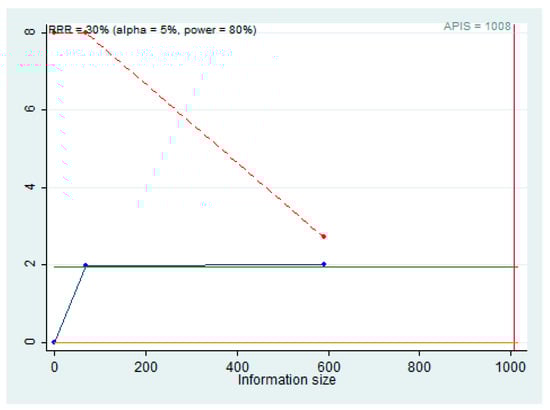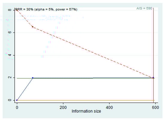 The results suggest that the quality of the evidence was low. A trial sequential analysis (TSA) was performed to evaluate the strength of the results of the meta-analysis and to adjust the results to avoid type I and II errors. The program used was Stata 13 (StataCorp, College Station, TX, USA), with the integration of the R 4.2 software through the metacumbounds commands, as described by Miladinovic et al. [41]. The O’Brien–Fleming spending function was used by applying fixed effects. The AIS (accrued information size) (Figure 5), and subsequently APIS (a priori information size) (Figure 5) commands were used by the Dialog BOX to determine the optimal sample size and for the power of the results assuming an RRR (reduction risk relative) of 30%, an alpha value equal to 5% (type 1 error), and a beta value of 20% (type 2 error) (Figure 6).