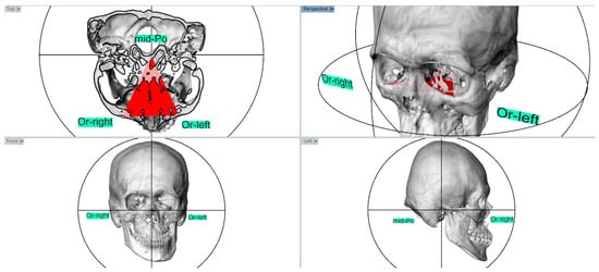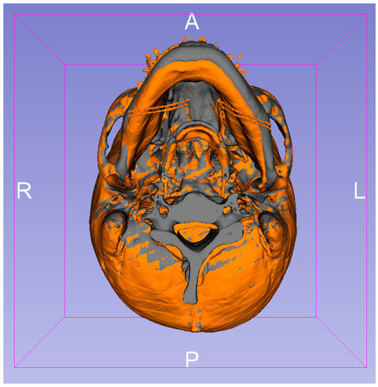 - Ruellas, A.C.; Tonello, C.; Gomes, L.R.; Yatabe, M.S.; Macron, L.; Lopinto, J.; Cevidanes, L.H. Common 3-dimensional coordinate system for assessment of directional changes. Am. J. Orthod Dentofac. Orthop. 2016, 149, 645–656. [Google Scholar] [CrossRef] [PubMed]