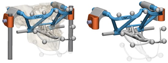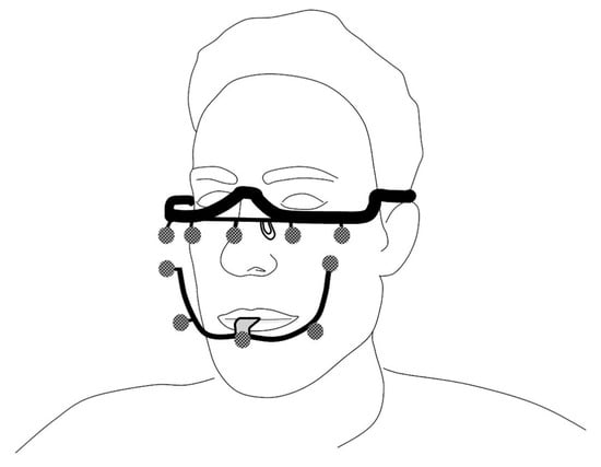 The 4D-scanning was performed with a 4D optical tracking module (Planmeca 4D Jaw Motion) installed in a CBCT scanner (Planmeca ProMax, Planmeca, Helsinki, Finland). The resolution of the CBCT images was 0.4 × 0.4 × 0.4 [mm] with a field of view of 230 [mm]. The subjects had to wear a polyamide maxillary frame, which rests on the nasal bridge and ears, and an aluminium mandibular frame rigidly connected to the lower dental arch and orthodontic brackets by means of an easily removable dental bite registration putty (Exabite TT NDS, GC America INC. Alsip, IL, USA). Both the maxillary frame and the mandibular frame accommodated five optical tracer spheres which could be optically recorded by the system (Figure 2). The CBCT scan was performed in maximum dental occlusion with the patient sitting up straight and in natural head position. The field of view was set to include the complete mandible and the maxilla as well as the orbits. Subsequently, movement exercises were carried out and recorded in real time with a frame rate of 24 [Hz].