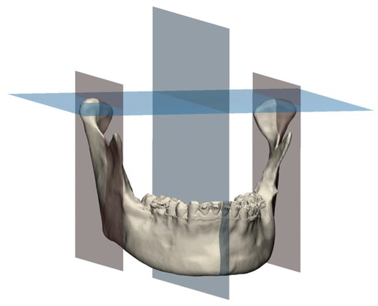 The CBCT scan segmentations were performed in the Mimics 22.0 software (Materialise, Leuven, Belgium) and 3D-models of the mandible and maxilla were created. These models were imported into the 3-Matic Medical 15.0 software (Materialise, Leuven, Belgium) to determine the Frankfurt horizontal plane (FHP) and orthogonally positioned midsagittal plane. Parallel to the midsagittal plane, planes were created in the medio-lateral middle of each condyle. These mid-condylar planes were 100 × 100 [mm] in dimension and triangulated with a maximum edge length of 0.2 [mm]. Subsequently, the mid-condylar planes were merged with the 3D-model of the mandible and exported together with the maxilla model as standard tessellation language (STL) files (Figure 3).