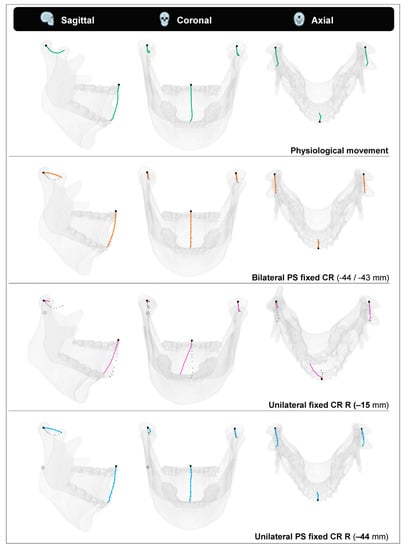 Condylar and incisal point traces describing the mouth opening movement in four different scenarios. Top to bottom: Physiological movement describes the actual recorded movement pattern for this specific subject. Bilateral PS fixed CR describes a simulated mouth opening around the patient-specific (PS) axis of rotation determined with our workflow. Unilateral fixed CR R describes a simulated mouth opening with a fixed centre of rotation (CR) at 15 mm inferior to the centre of condyle (CoC) and the physiological movement of the left condyle. Unilateral PS fixed CR R describes a simulated mouth opening with a fixed CR at the PS determined position, 44 mm inferior to the CoC and the physiological movement of the left condyle. The dotted traces in the three simulated mouth openings indicate the physiological movement traces. Note the severe lateral deviation that occurs when the CR is positioned much closer to the CoC than PS determined.
