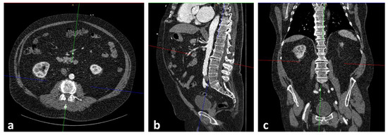 Process of slice selection using the Extended Multiplanar Reconstruction Plugin in IMPAX. The axial slice (a) was aligned parallel to the superior endplate of the third lumbar vertebrae at sagittal (b) and coronal (c) reconstructions.