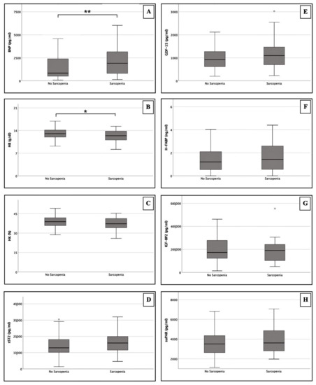 Among the analyzed biomarkers, only HB and hematocrit (HK) showed lower plasma levels in sarcopenic patients compared to non-sarcopenic patients (HB: 12.40 ± 2.90 g/dL vs. 13.05 ± 2.17 g/dL; HK: 37.20 ± 7.70% vs. 38.80 ± 6.10%). However, a statistically significant difference between both groups could only be calculated for HB (p = 0.024).