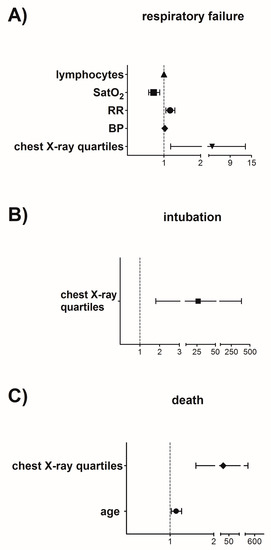 Multivariate analysis-Forest Plots. Statistically significant variables in univariate analysis were evaluated in a multiple logistic regression model with gender, age, body mass index (BMI), Charlson comorbidity index (CCI), and national early weaning score (NEWS) 2 treated as covariates, while progression to respiratory failure, intubation and death were considered as dependent variables: (A) involvement of all four chest X-ray quartiles (p = 0.026), higher systolic blood pressure [mmHg, (p = 0.041)], higher respiratory rate [breaths per min, (p = 0.004)], lower SatO2 [%, (p = 0.002)] and lymphopenia [cells/μL, (p = 0.026)] were independent risk factors of the development of respiratory failure; v (B) involvement of all four chest X-ray quartiles (p = 0.017) was an independent predictor of intubation; (C) older age [years, (p = 0.014)] and involvement of all four chest X-ray quartiles (p = 0.021) were independent predictors of death. Calculated estimates are shown as odds ratios (OR), with 95% confidence intervals (CI). For quantitative variables, OR reflects changes per given unit. p-values < 0.05 were consider significant.