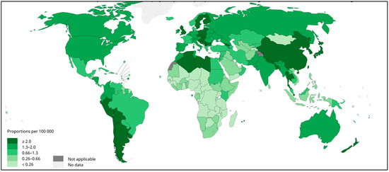 Gallbladder cancer incidence in both sexes, worldwide, 2020. Estimated age-standardized rates (World) per 100,000 per year. Data source: GLOBOCAN 2020. WHO, IARC: https://gco.iarc.fr/today/ (accessed on 23 July 2022).